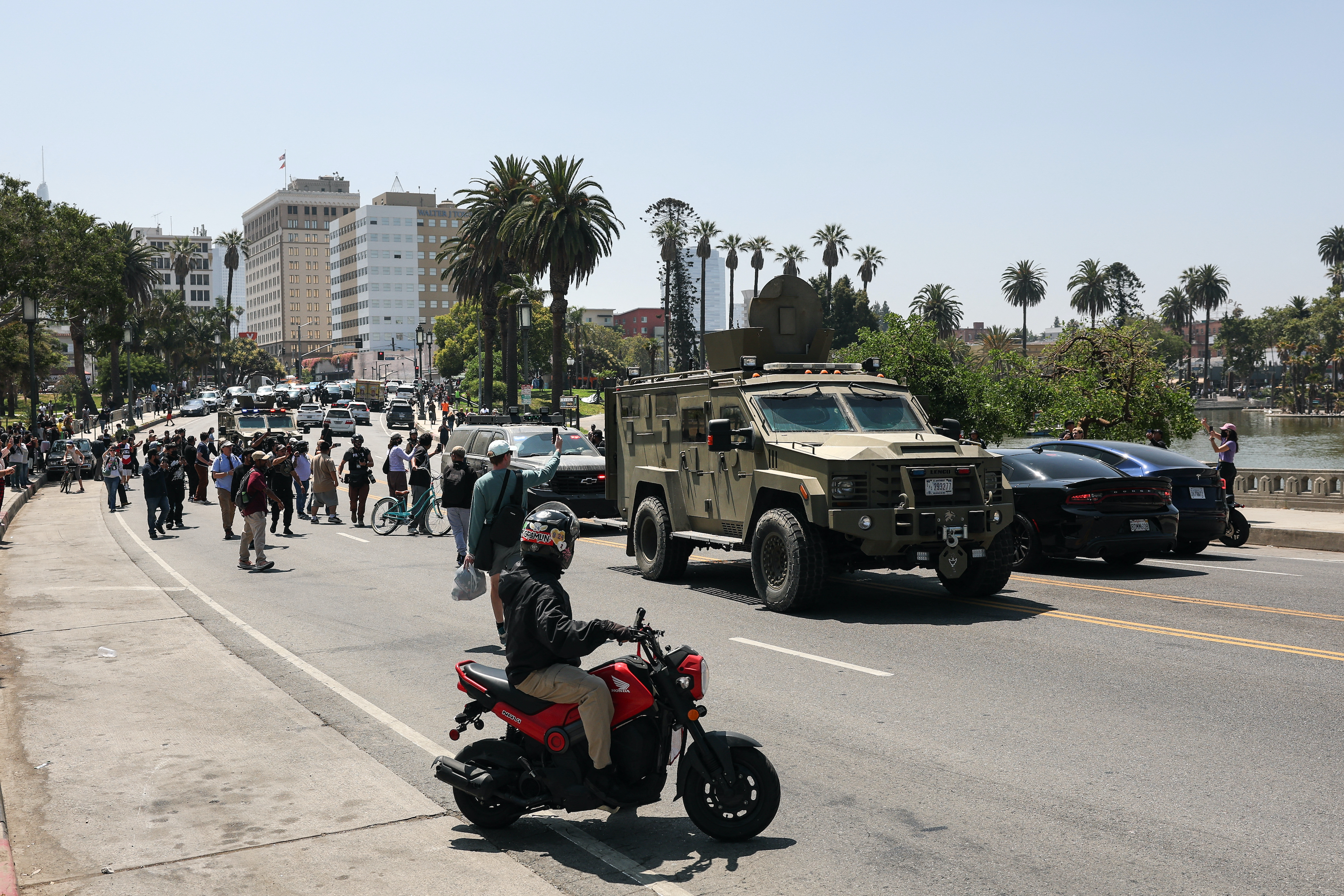 U.S. Customs and Border Protection agents ride an armored vehicle down Wilshire Boulevard near MacArthur Park in Los Angeles on July 7, 2025. (Patrick T. Fallon/AFP via Getty Images)
