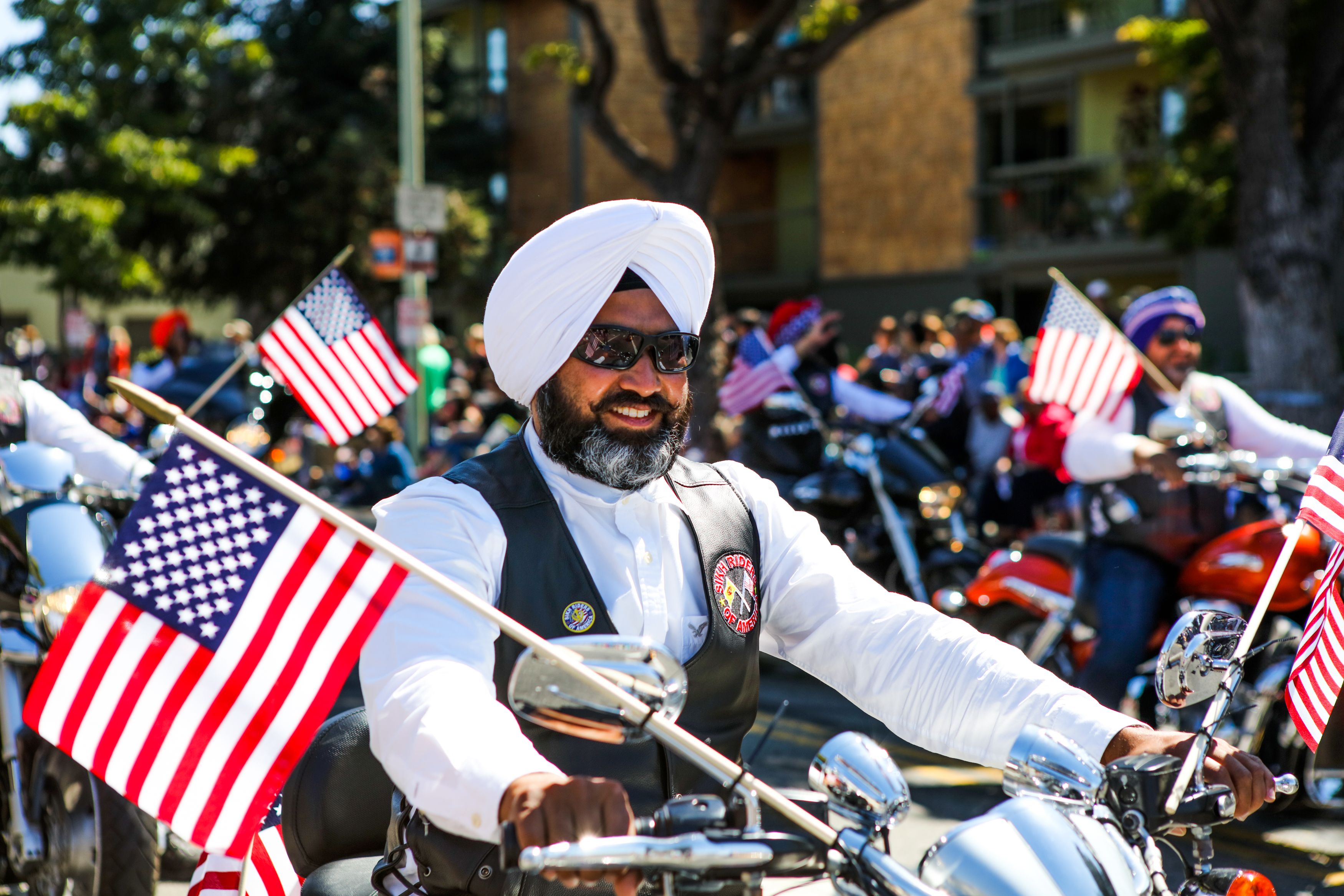 A Sikh man rides on a motorcycle with the "Sikh Riders of America" group during the 4th of July Parade in Alameda, Calif., on July 4, 2016. (Gabrielle Lurie/AFP via Getty Images)