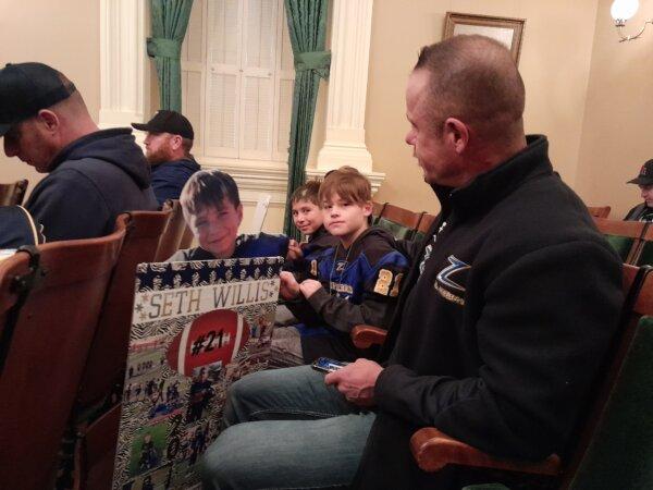 Coach David Hollar (R) and members of the Jr. Lincoln Zebra football team attended a hearing to speak out in opposition to a bill that would ban tackle football programs for youth under the age of 12, in Sacramento on Jan. 10, 2024. (Travis Gillmore/The Epoch Times)
