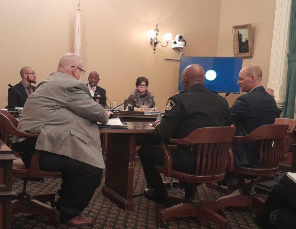 Ron White, president of the California Youth Football Alliance (Front L) and Sacramento Sheriff Jim Cooper (Front C) testify in opposition to AB 734 in Sacramento, Calif., on Jan. 10, 2024. (Travis Gillmore/The Epoch Times)
