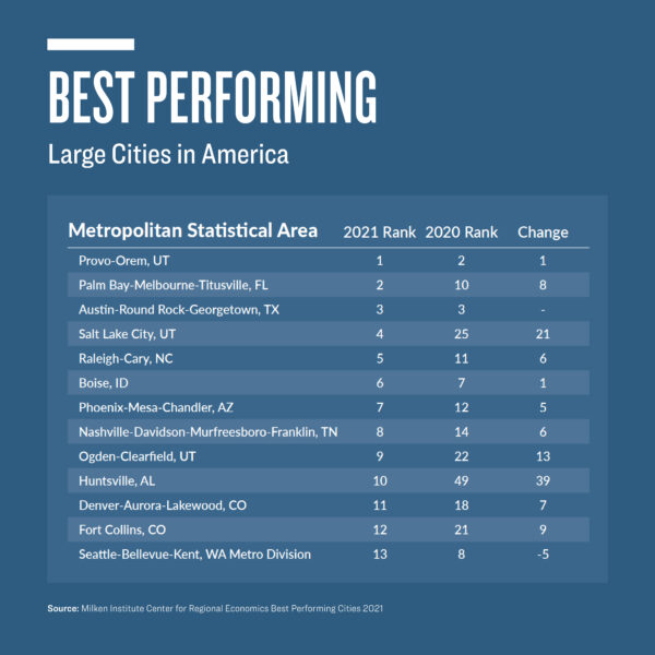 This year’s top large metropolitan area in the nation was Provo-Orem, Utah. The region took the top spot “on the strength of job, wage and high-tech GDP growth,” the authors wrote.