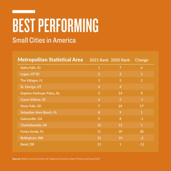 This year’s top small metropolitan area in the U.S. was Idaho Falls, Idaho. Idaho Falls “experienced short- term job growth of 4.7 percent and includes the ninth-best high-tech GDP concentration among all small cities,” according to the report.