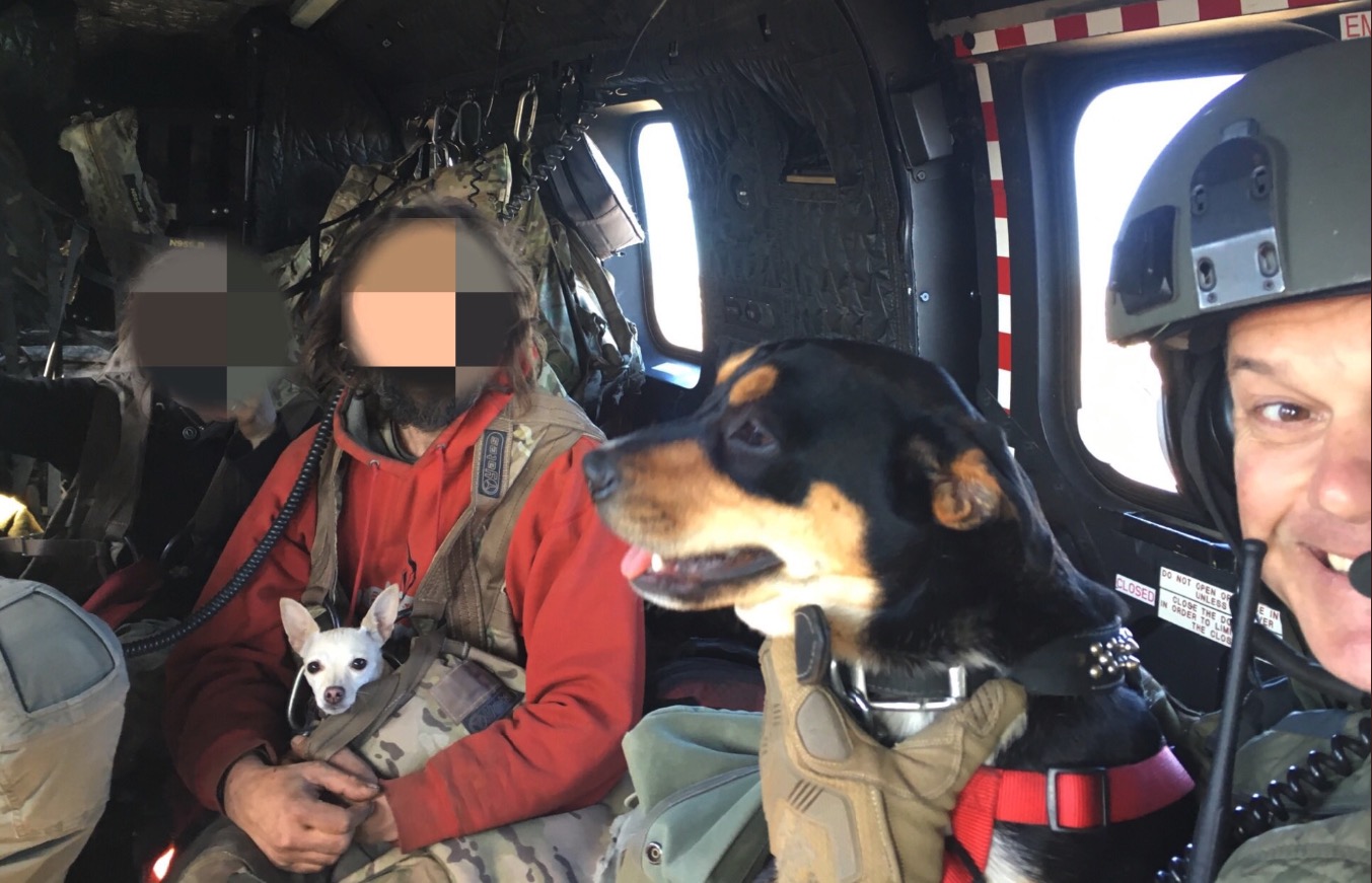 The crew brought the couple and dogs to safety. While uninjured, the couple was reportedly tired, hungry, and dehydrated.