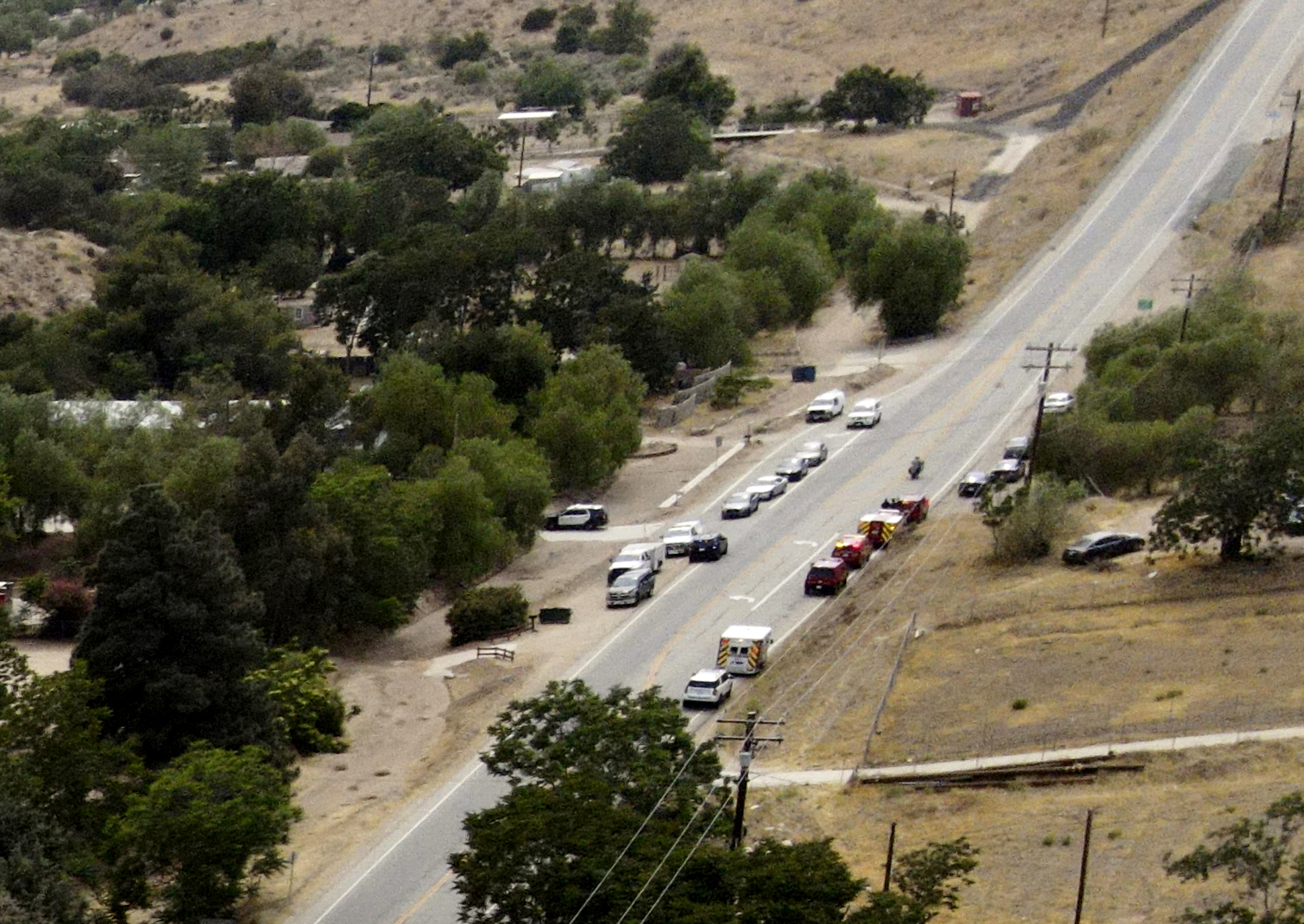A fire engulfs a house and TV helicopter reporters said a body that may be the gunman was visible outside the home, in Acton, Calif., on June 1, 2021. (David Swanson/AP Photo)
