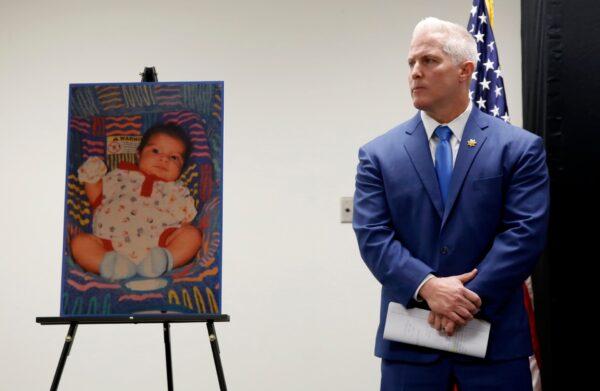 Yolo County District Attorney Jeff Reisig stands next to a photo of one of five infants believed to be killed by their father during a news conference in Woodland, Calif., on Jan. 27, 2020. (Rich Pedroncelli/AP Photo)