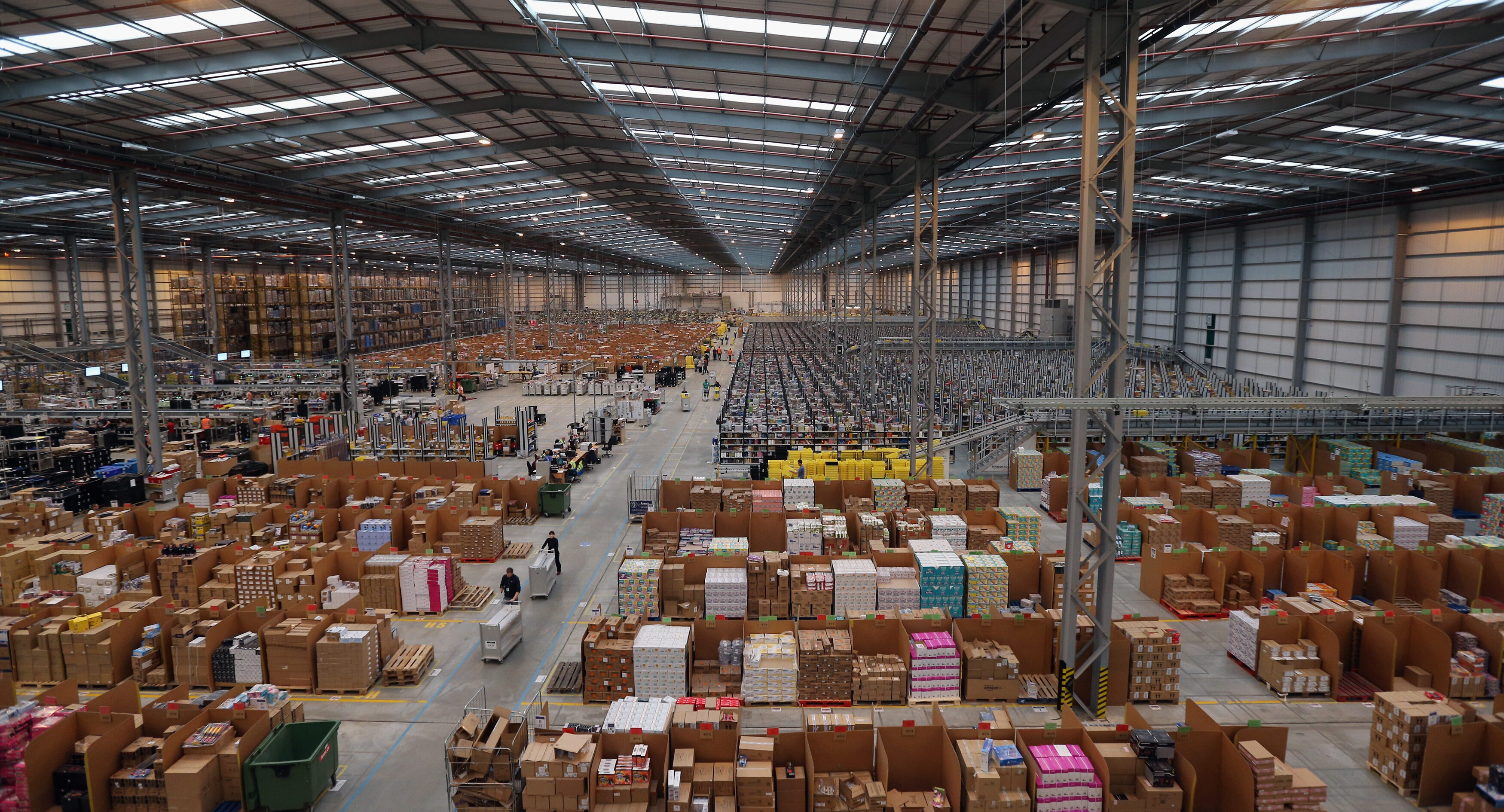 A worker assembles a box for delivery at the Amazon fulfillment center in Baltimore, Maryland, on April 30, 2019. (Clodagh Kilcoyne/Reuters)