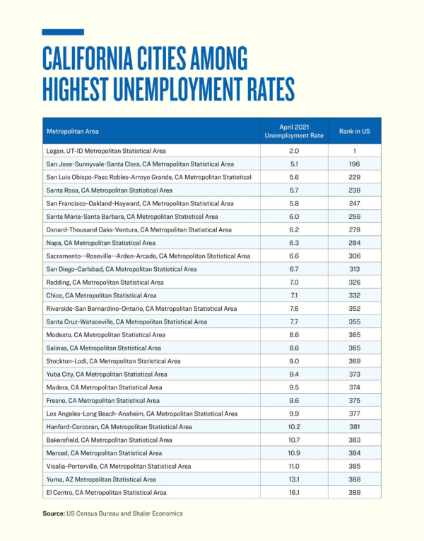 Of the 27 California metropolitan areas tracked by the U.S. Census Bureau, all rank in the bottom half for employment.