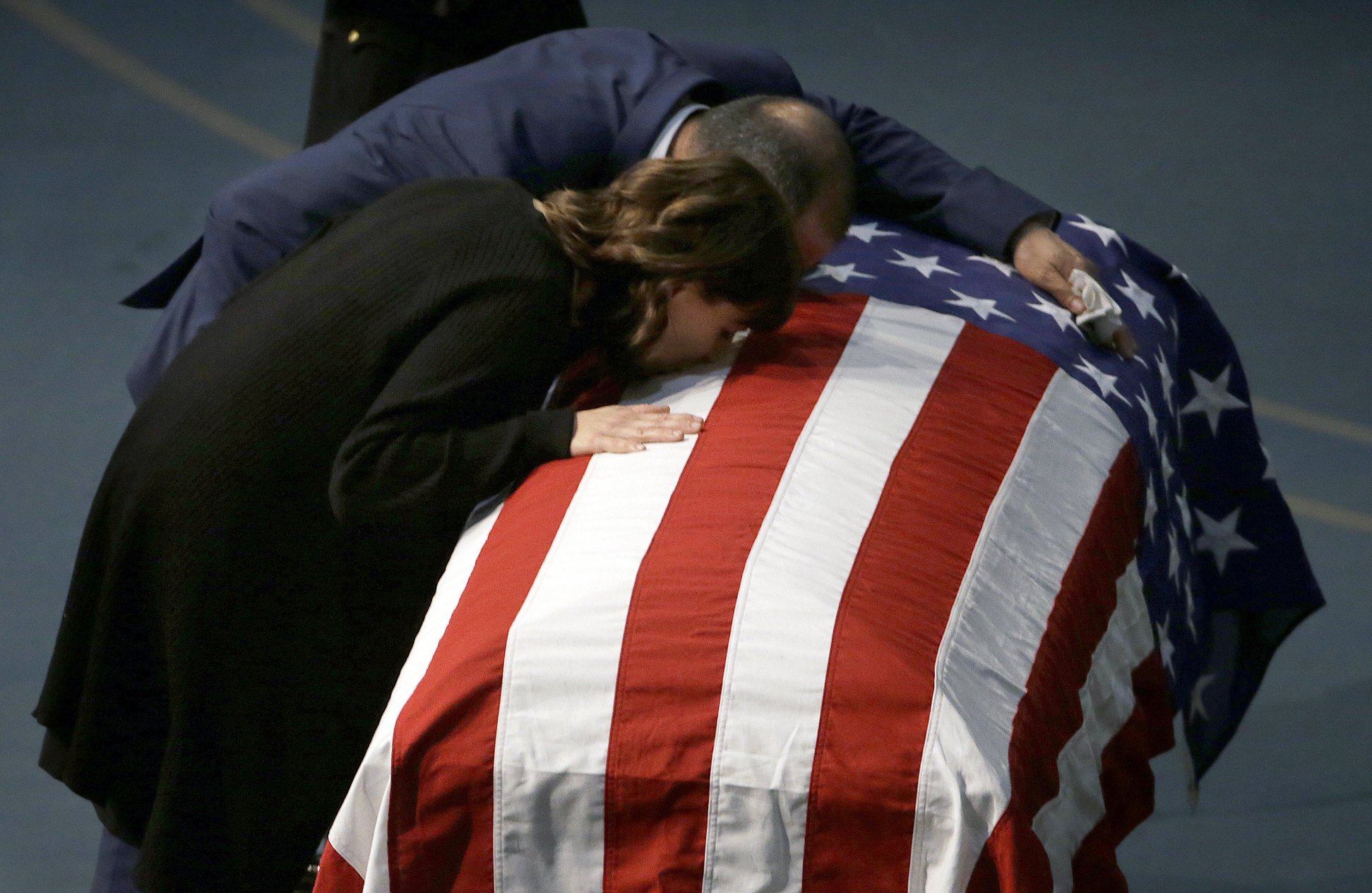 Lupe Corona and Merced Corona kiss the flag draped coffin of their daughter, Davis Police Officer Natalie Corona, during funeral services for Natalie Corona at the University of California, Davis, in Davis, Calif., on Jan. 18, 2019. (Rich Pedroncelli, Pool/AP)