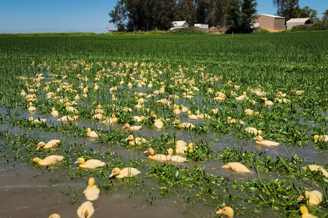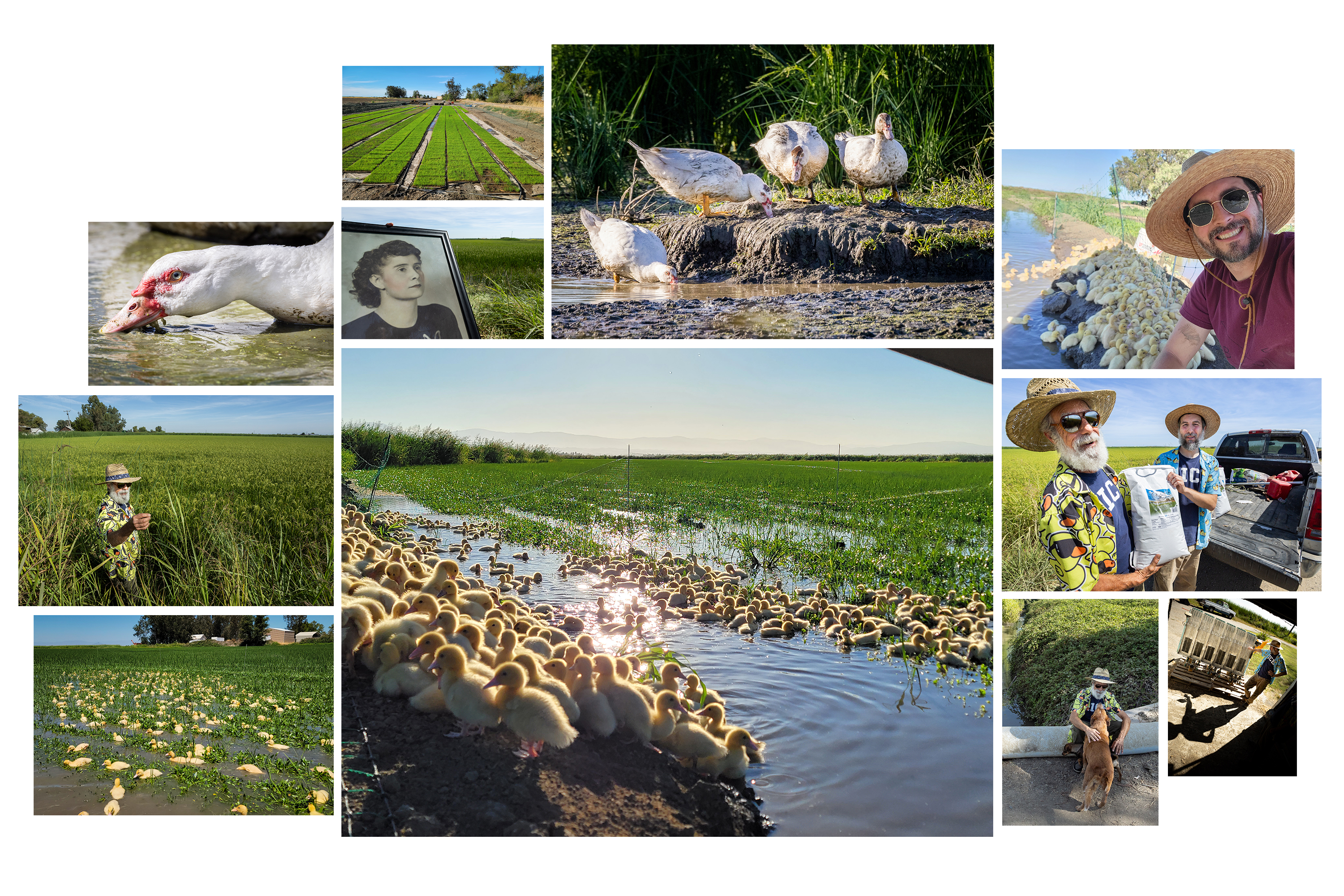 They are among the few organic rice farmers in North America trying the Japanese integrated duck–rice farming method to control weeds, conserve water, and fertilize their rice fields without using synthetic nitrogen fertilizers, chemical pesticides, and herbicides.