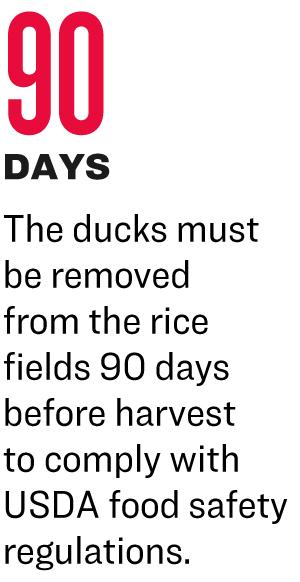 In addition, the ducks must be removed from the rice fields 90 days before harvest for food safety reasons to comply with Department of Agriculture regulations, he said.