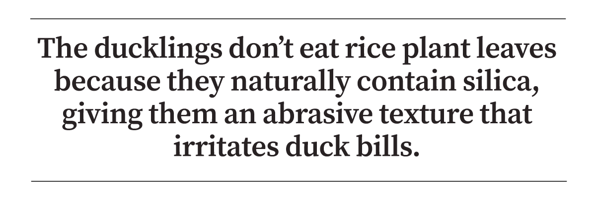 Integrated duck–rice farming is based on the symbiotic relationship between ducks and rice paddies. Ducklings, as young as 2 days old, are released into rice fields to eat weeds, insects, and invertebrates that can threaten the crop. The ducklings don’t eat rice plant leaves because they naturally contain silica, giving them an abrasive texture that irritates duck bills.