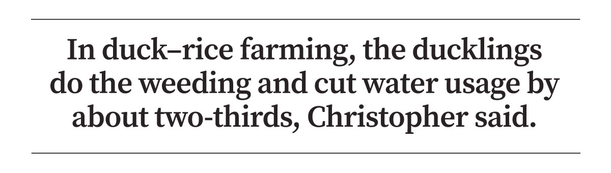 But in duck–rice farming, the ducklings do the weeding and cut water usage by about two-thirds, Christopher said.