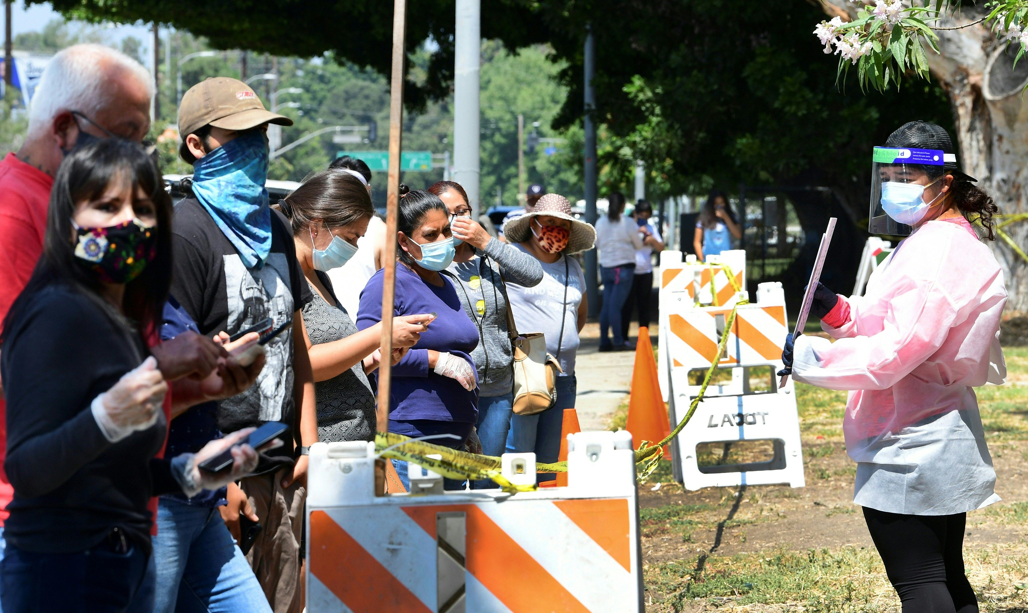 An officer directs traffic in front of a COVID-19 drive-through test site in Los Angeles, Calif., on July 17, 2020. (Frederic J. Brown /AFP via Getty Images)