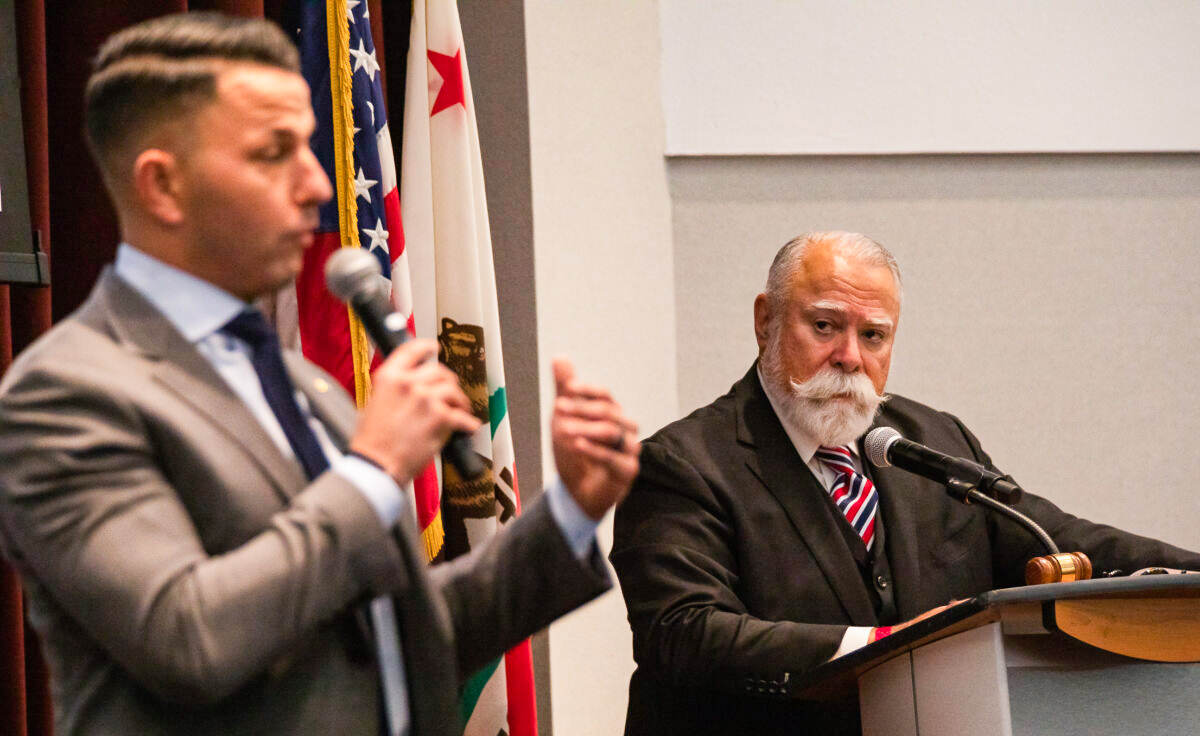 California Republican candidates for Attorney General Eric Early (R) and Nathan Hoffman (L) speak at the Yorba Linda Community Center in Yorba Linda, Calif., on March 24, 2022. (John Fredricks/The Epoch Times)