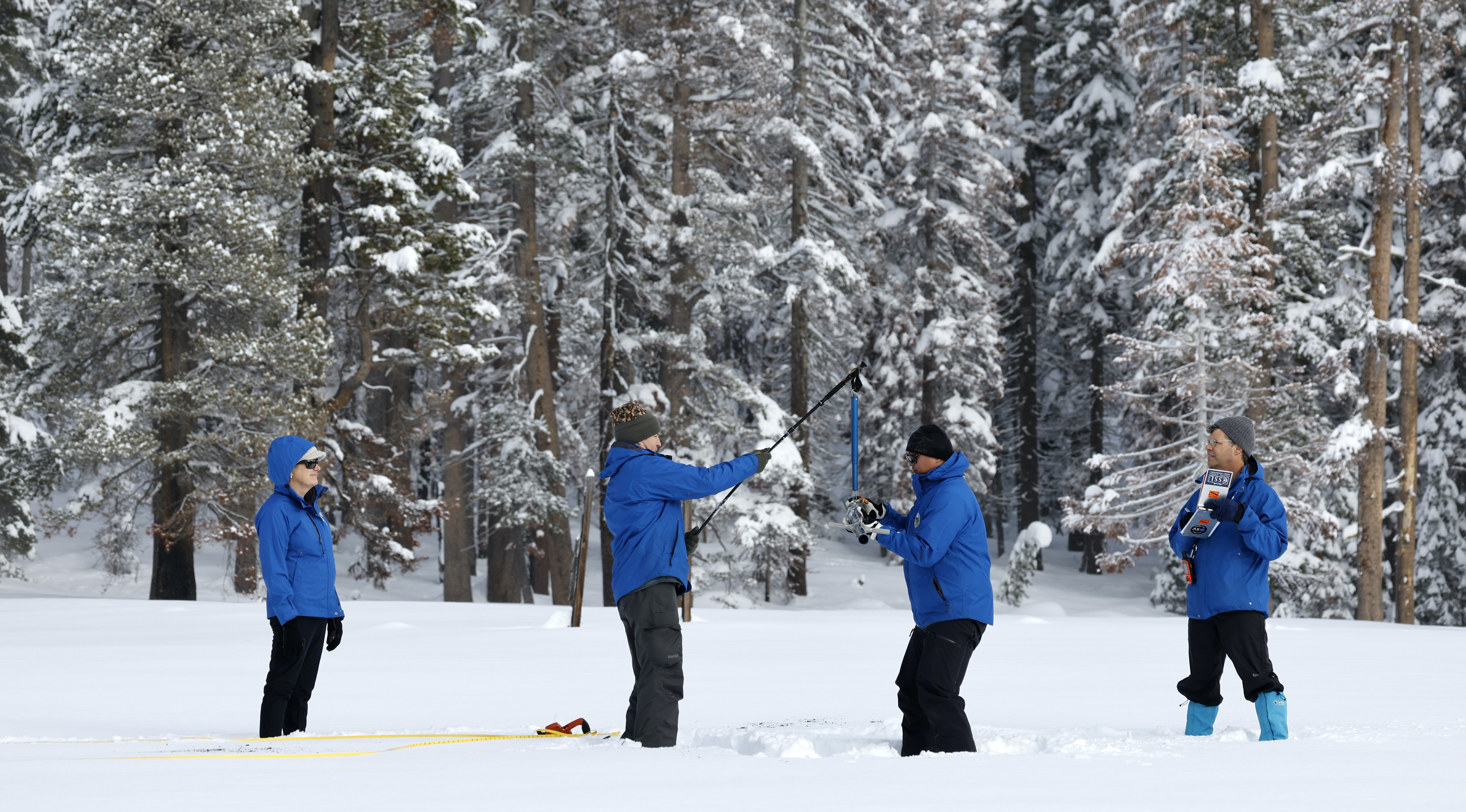 State water officials took the year’s first official measurements of snow and water content near Phillips, a town east of Sacramento in the central Sierra Mountains, finding levels well above average for this time of year.