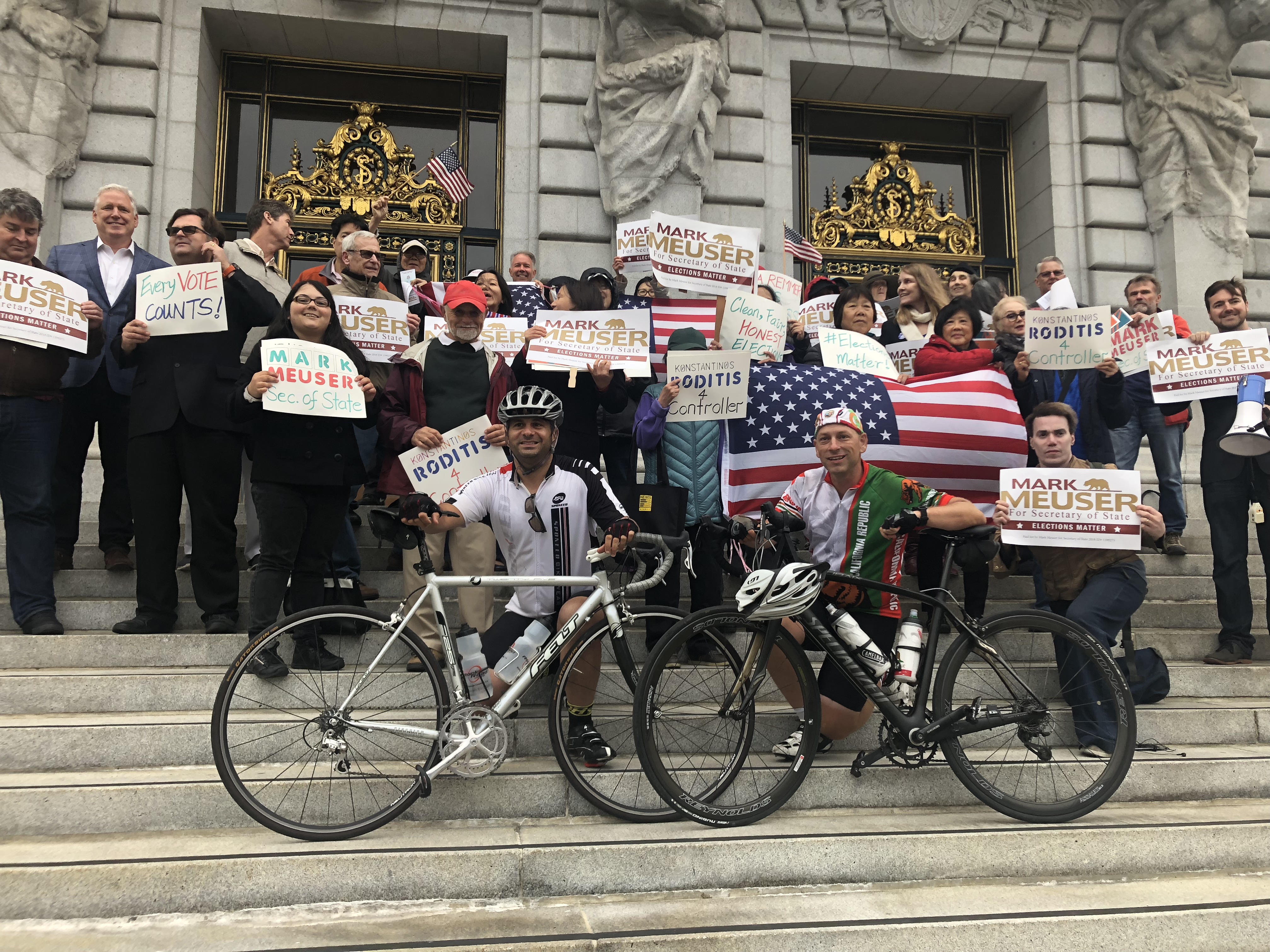 Mark Meuser for secretary of state and Konstantinos Roditis for state controller have campaigned on their mountain bikes. Meuser started the tour by himself from Martinez County on July 9, and Roditis joined him on Aug. 1.