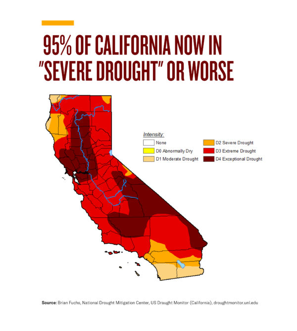 The current drought and California’s not building more water infrastructure to conserve water during wet years are combining to put large amounts of America’s table food at risk.