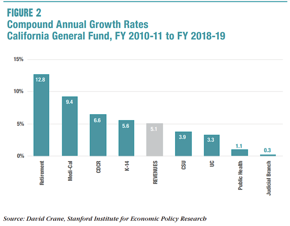 You don’t need an 800 score on your Math SAT to see the growth in retirement (public-employee pensions) and Medi-Cal welfare are growing so fast they will chew up any new revenue generated by Silicon Valley.