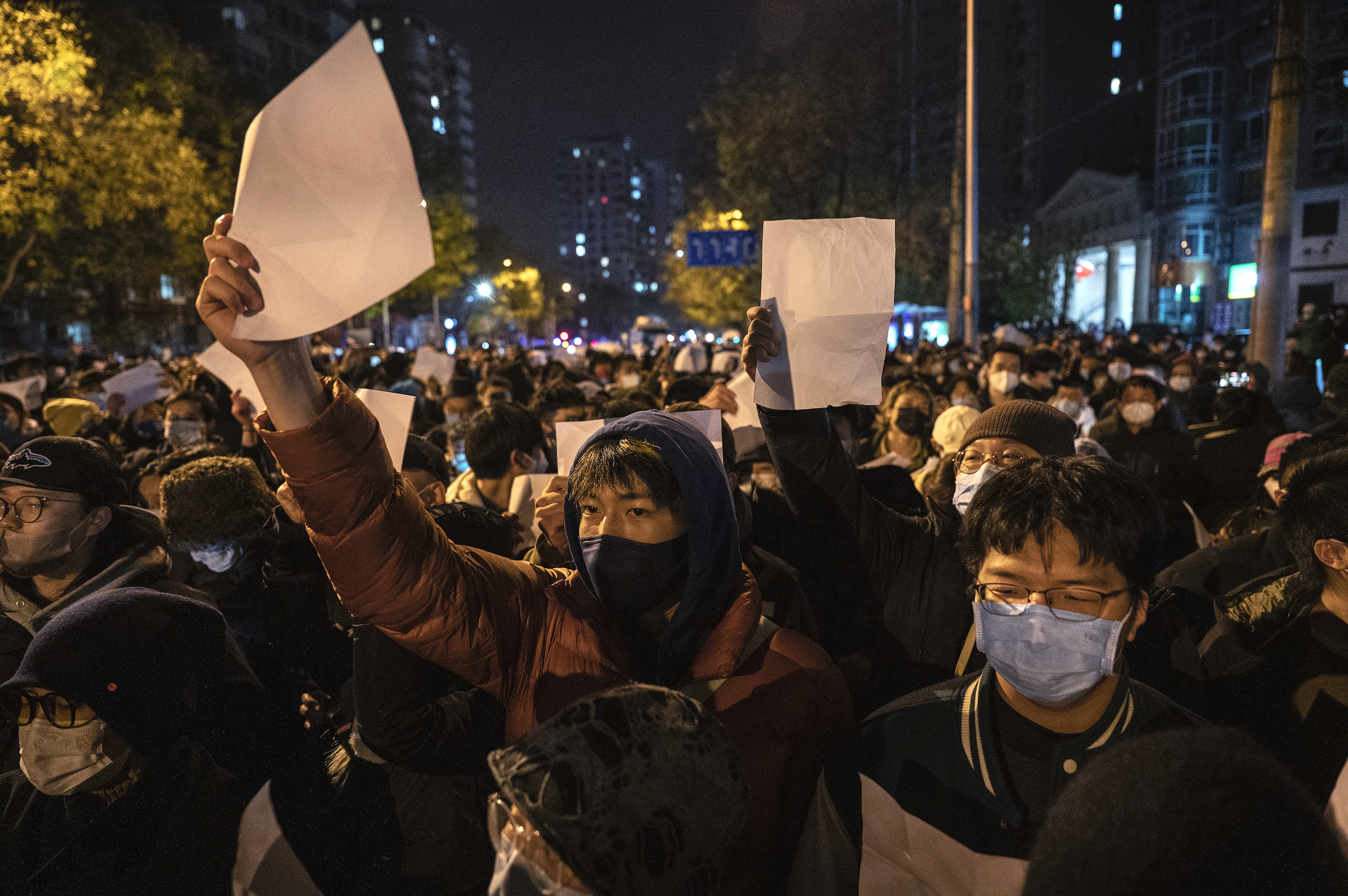 Protesters hold up a white piece of paper against censorship as they march during a protest against China's strict zero-COVID measures in Beijing on Nov. 27, 2022. (Kevin Frayer/Getty Images)