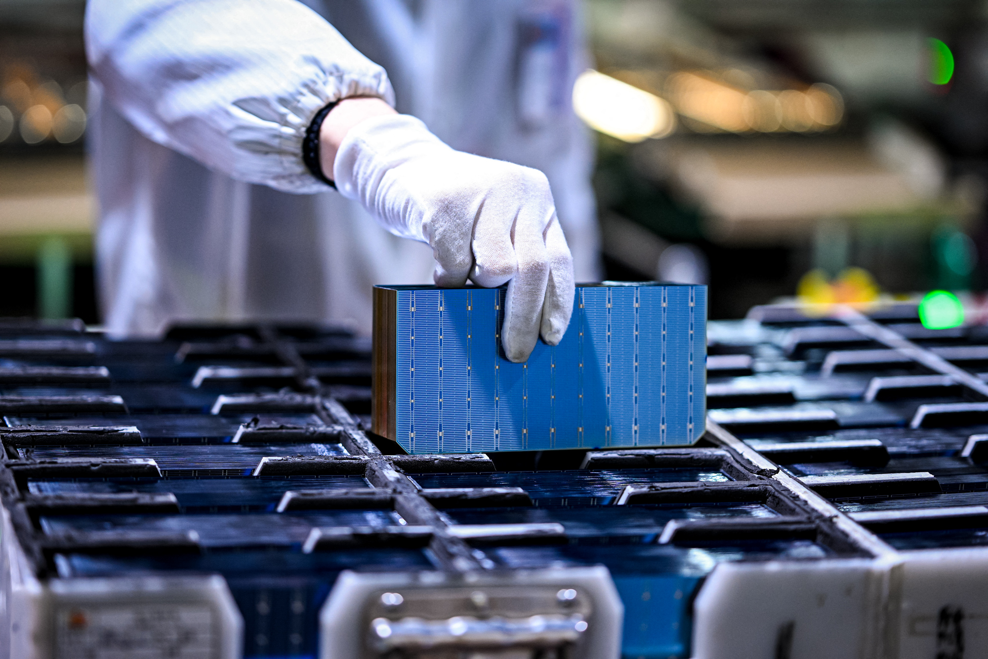 Workers carry solar panels to be installed in the desert at the Ningguoyun Lingwu 1 million kilowatt photovoltaic project in Lingwu, Ningxia region, China, on April 14, 2025. (AFP via Getty Images)