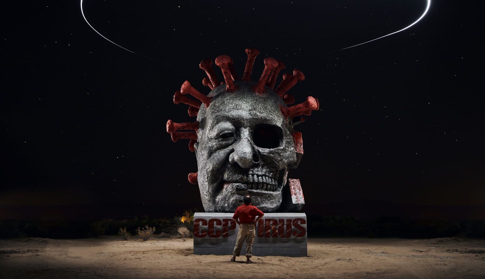 The front portion of the sculpture consisted of half of Chinese leader Xi Jinping’s face, while the other half was the face of an evil-looking skeleton. There were pins depicting COVID-19 spike proteins all around the sculpture’s cranium.