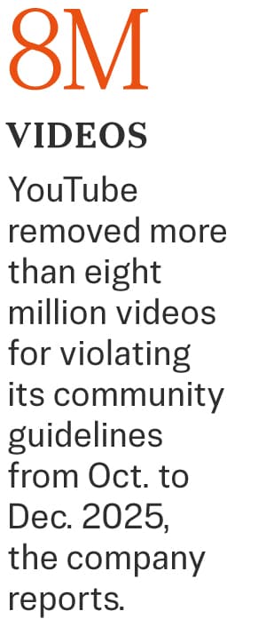 YouTube removed more than 8 million videos for violating its community guidelines from October to December 2025, the latest period for which it provides reporting. The vast majority, 64 percent, were pulled for child safety reasons.