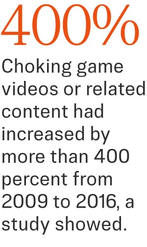Searching with popular challenge names, altered slightly to get around the site’s bans, produced myriad videos of adolescents hyperventilating and passing out, with or without friends pressing on their carotid arteries, and choking one another until they lose consciousness.