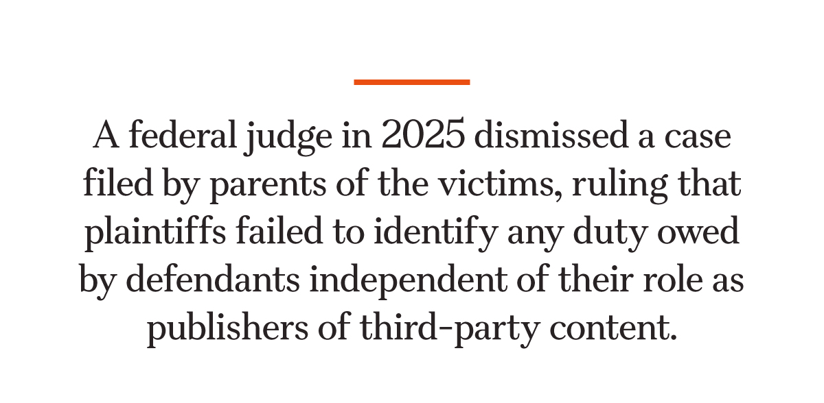 A federal judge dismissed the case, ruling that plaintiffs failed to identify any duty owed by defendants independent of their role as publishers of third-party content, which is broadly protected from liability and negligence claims by the First Amendment and Section 230 of the Communications Decency Act.