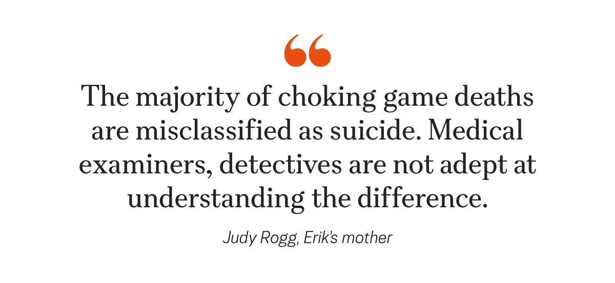 “The majority of choking game deaths are misclassified as suicide. Medical examiners, detectives are not adept at understanding the difference. They walk in, it looks like suicide, they check a box and leave,” she said, noting that parents often struggle to change a death certificate after the fact.