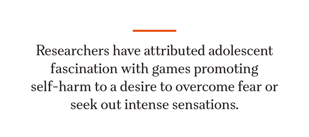 Researchers have attributed adolescent fascination with games promoting self-harm to a desire to overcome fear or seek out intense sensations, including the sense of power after surviving a potentially fatal challenge, or to escape reality in times of frustration or anxiety.