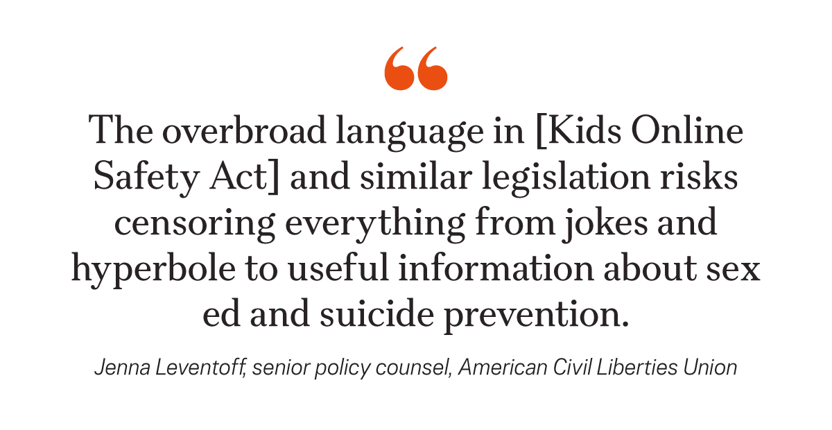 “The overbroad language in KOSA and similar legislation risks censoring everything from jokes and hyperbole to useful information about sex ed and suicide prevention,” Jenna Leventoff, senior policy counsel at the American Civil Liberties Union, said in a statement last year.