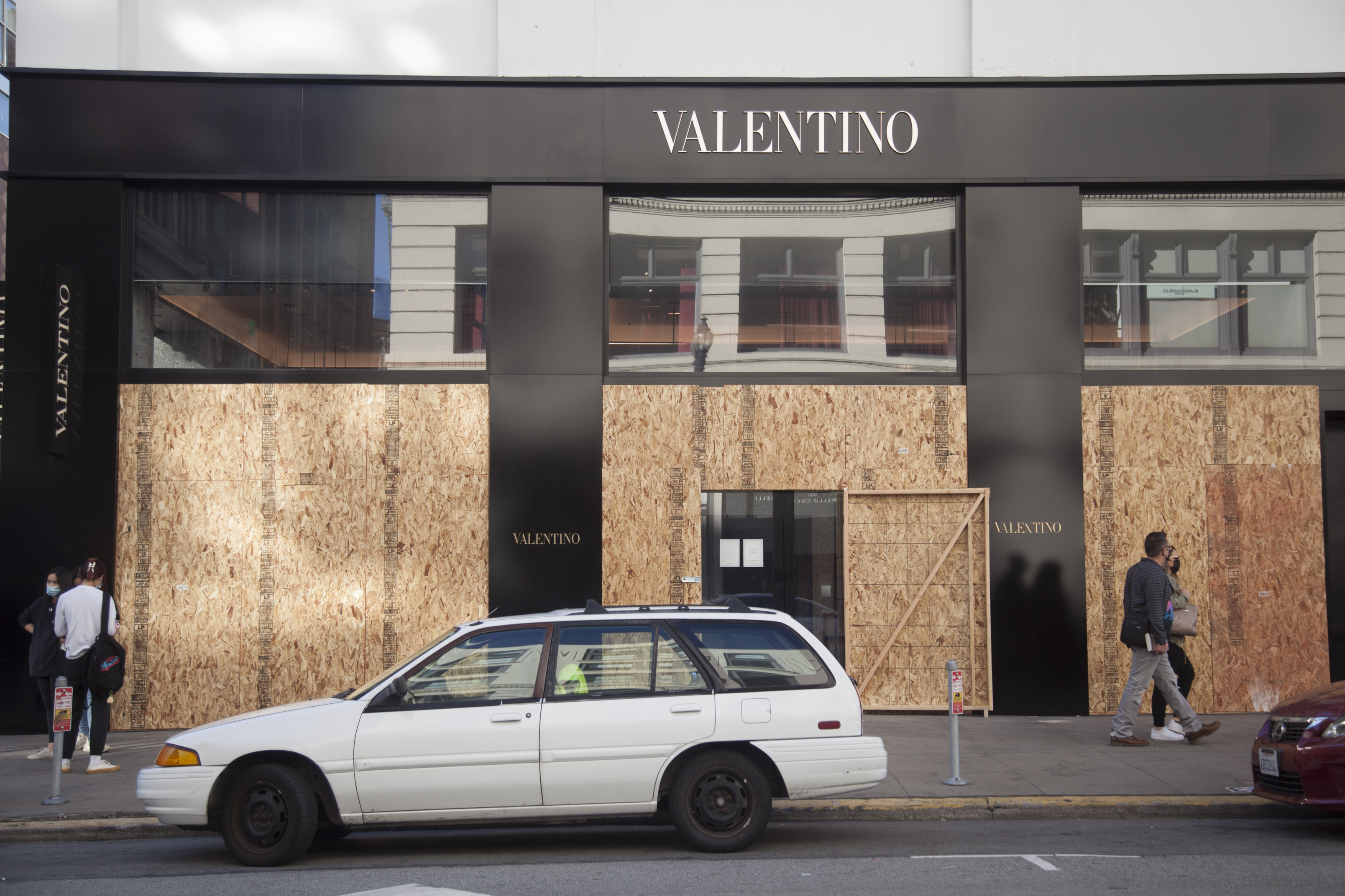 People walk past a boarded storefront window following recent robberies near Union Square in San Francisco on Dec. 2, 2021. (Eric Risberg/AP Photo)
