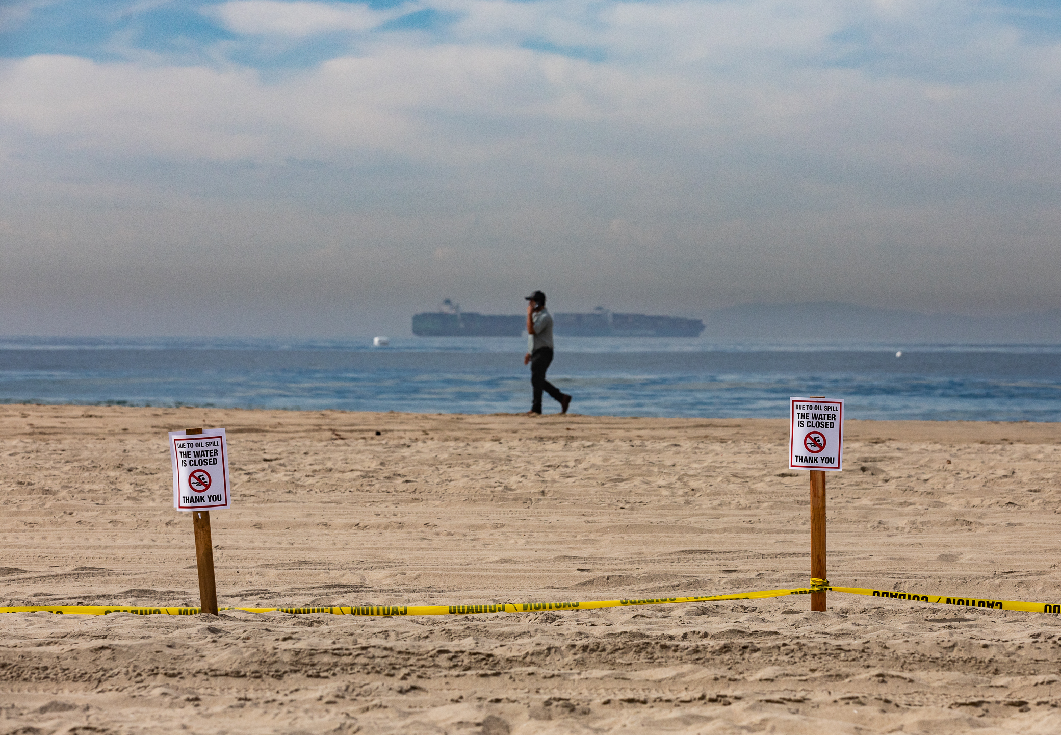 Oil also began to wash ashore in Newport Beach on Sunday, where officials were asking people not to enter the water, although they hadn’t officially closed the ocean.