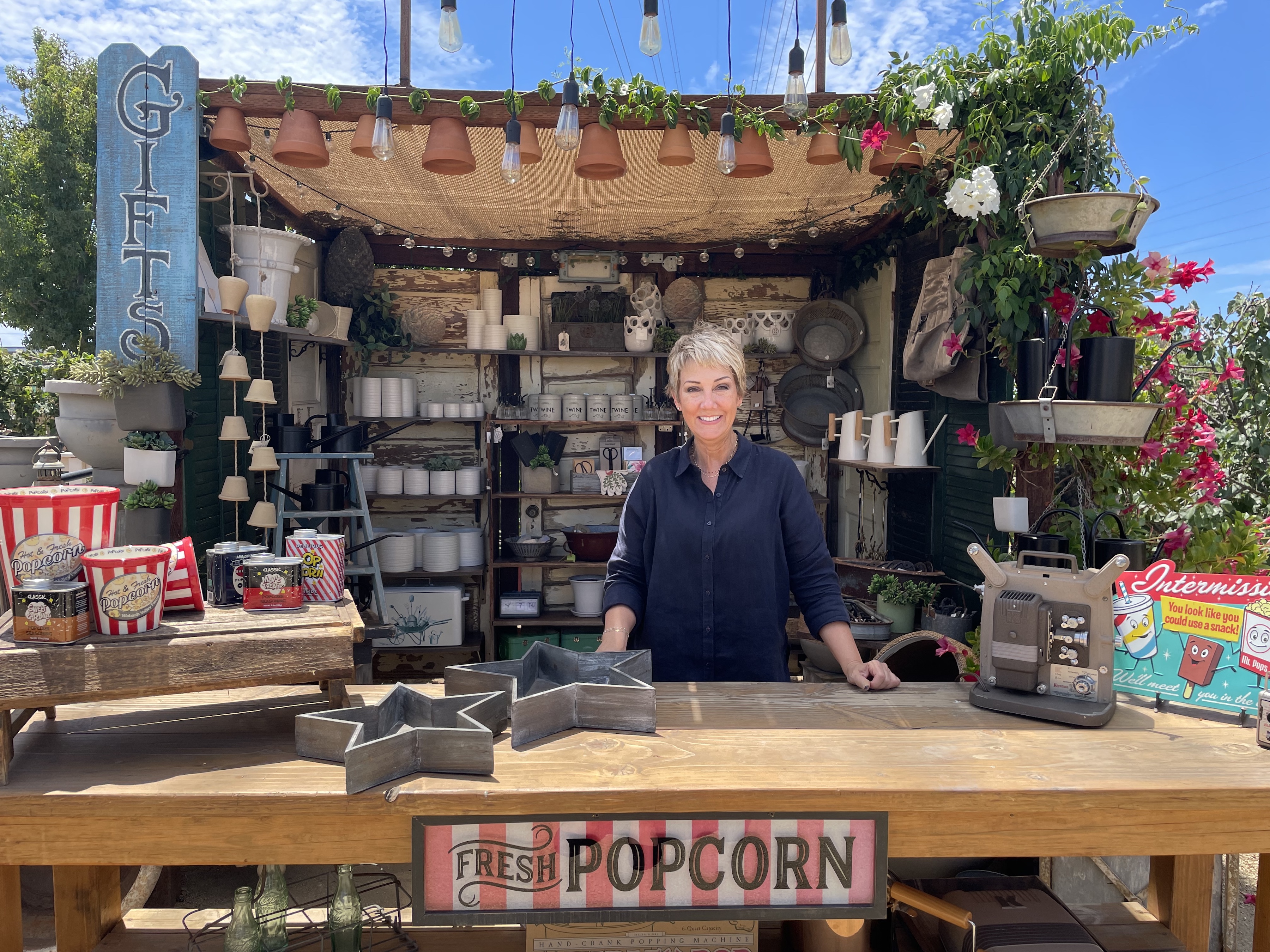 In addition to customizing and hand-painting the sink vanities, Manassero also added a miniature boutique inside the women’s stall, adorned with a variety of farmhouse gifts available for purchase so that customers “can shop even in the stall,” Manassero said.