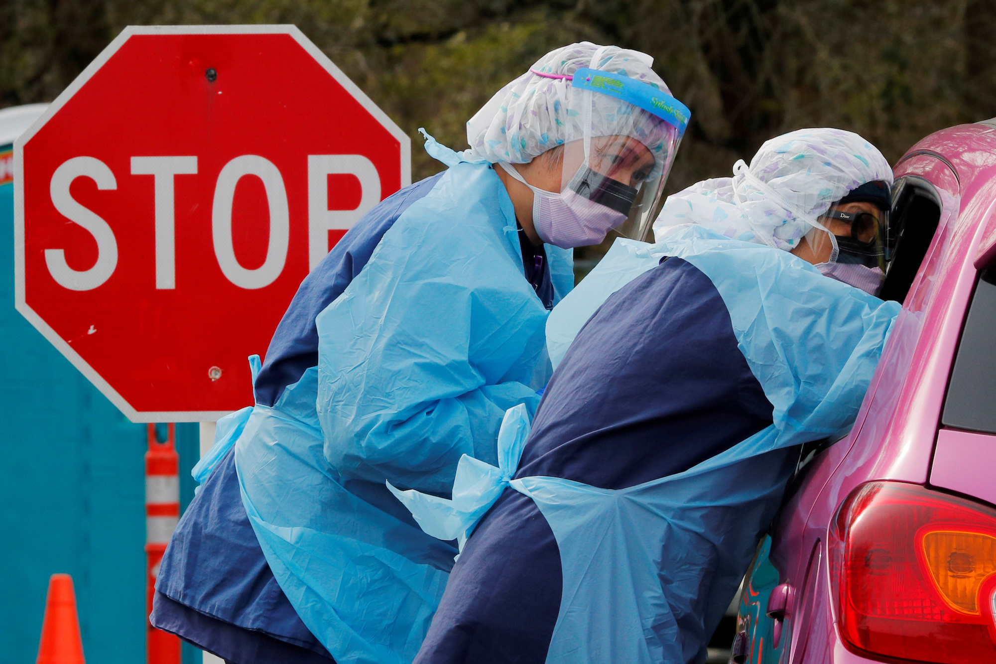A medical technician takes a sample to test for COVID-19 at a drive-through testing site in Medford, Mass., on April 4, 2020. (Brian Snyder/Reuters)