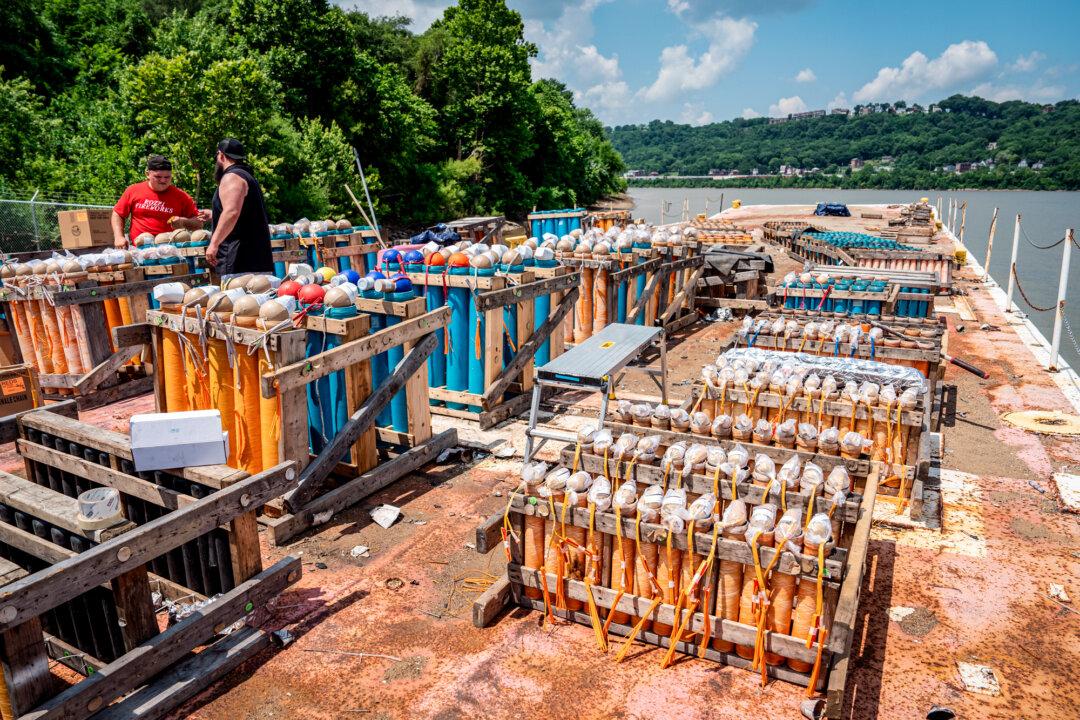 (Top) Workers place fireworks on mortars for a show by Rozzi’s Famous Fireworks along the Ohio River in Ludlow, Ky., on June 27, 2025. (Bottom) Fireworks are placed in mortars on a barge for a show along the Ohio River in Ludlow, Ky., on June 27, 2025. (Samira Bouaou/The Epoch Times)
