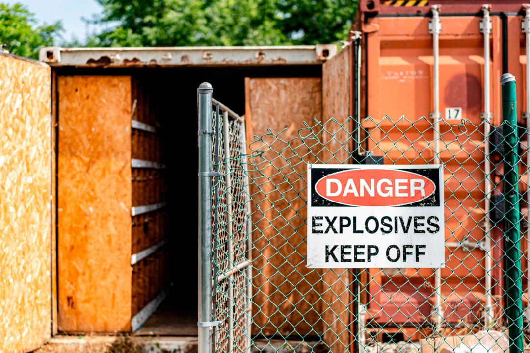 About 300,000 pounds of boxed fireworks sit in 28 metal shipping containers or boxcars, separated at specified distances from other structures. These “storage magazines” are lined with a non-sparking protective coating; each one must be secured with a special anti-theft lock.