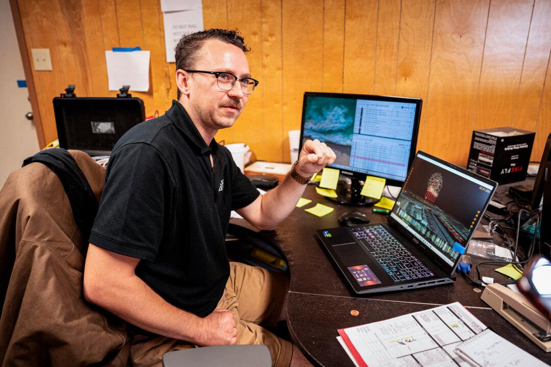 (Top) Tyler Wiesmann, a show designer for Rozzi’s Famous Fireworks, uses a computer to plan shows at the company’s office in Martinsville, Ohio, on June 26, 2025. (Bottom) Wiesmann uses a computer to plan shows at the company’s office in Martinsville, Ohio, on June 26, 2025. (Samira Bouaou/The Epoch Times)