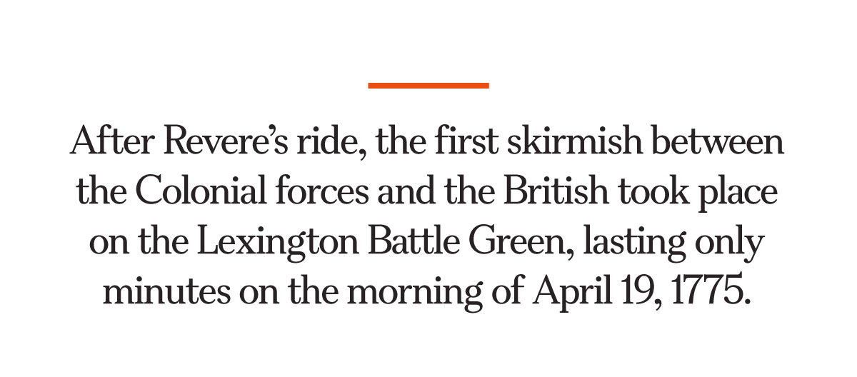 After Revere’s ride, the first skirmish between the colonial forces and the British took place on what’s now known as Lexington Battle Green, lasting only minutes on the morning of April 19, 1775. Eight minutemen died, shedding their blood for the dream of freedom.