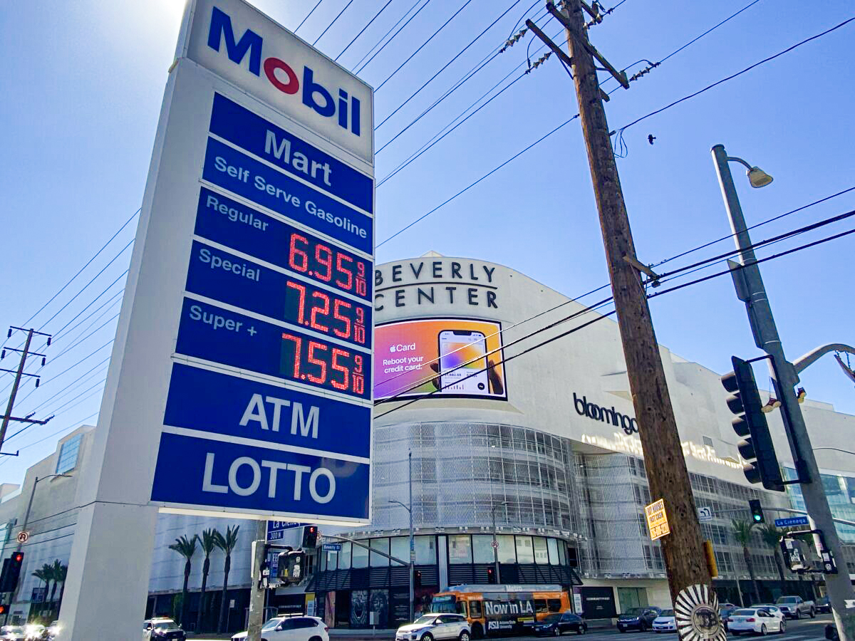 Beverly Center Mobile station in Beverly Hills reached $6.95 for a gallon of regular unleaded and $7.55 for super on March 7.