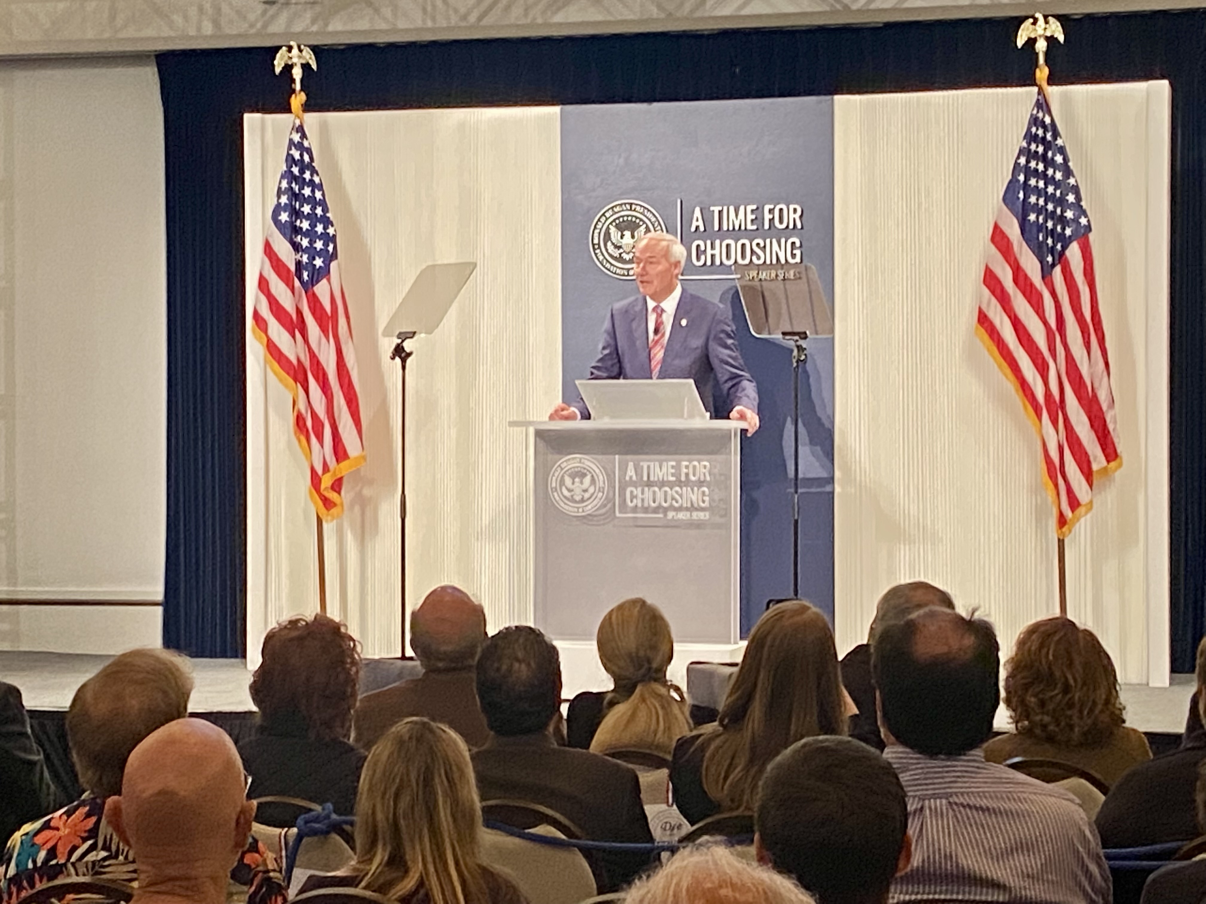 Arkansas Gov. Asa Hutchinson (R) speaks at the Ronald Reagan Presidential Library in Simi Valley, Calif., on Nov. 30, 2022. (Jill McLaughlin/The Epoch Times)