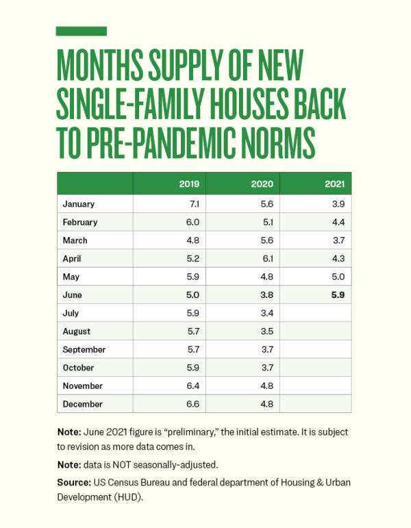 Since then, revised data shows that there were enough homes nationally in May to meet five months of purchase demand. Preliminary data for June 2021 shows there was enough for 5.9 months of new housing demand.