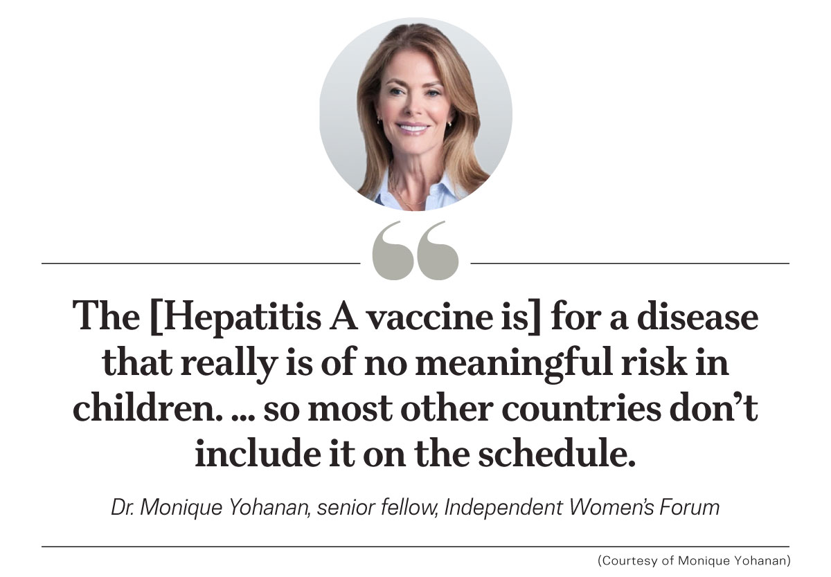 Rates of hepatitis A dropped following the introduction of the recommendation, particularly among children, Dr. Monique Yohanan, senior fellow for health policy at the Independent Women’s Forum, wrote in a white paper about rethinking the U.S. schedule. Yohanan said that vaccines are important for preventing disease, but recommendations should be updated to restore public trust and improve health outcomes.
