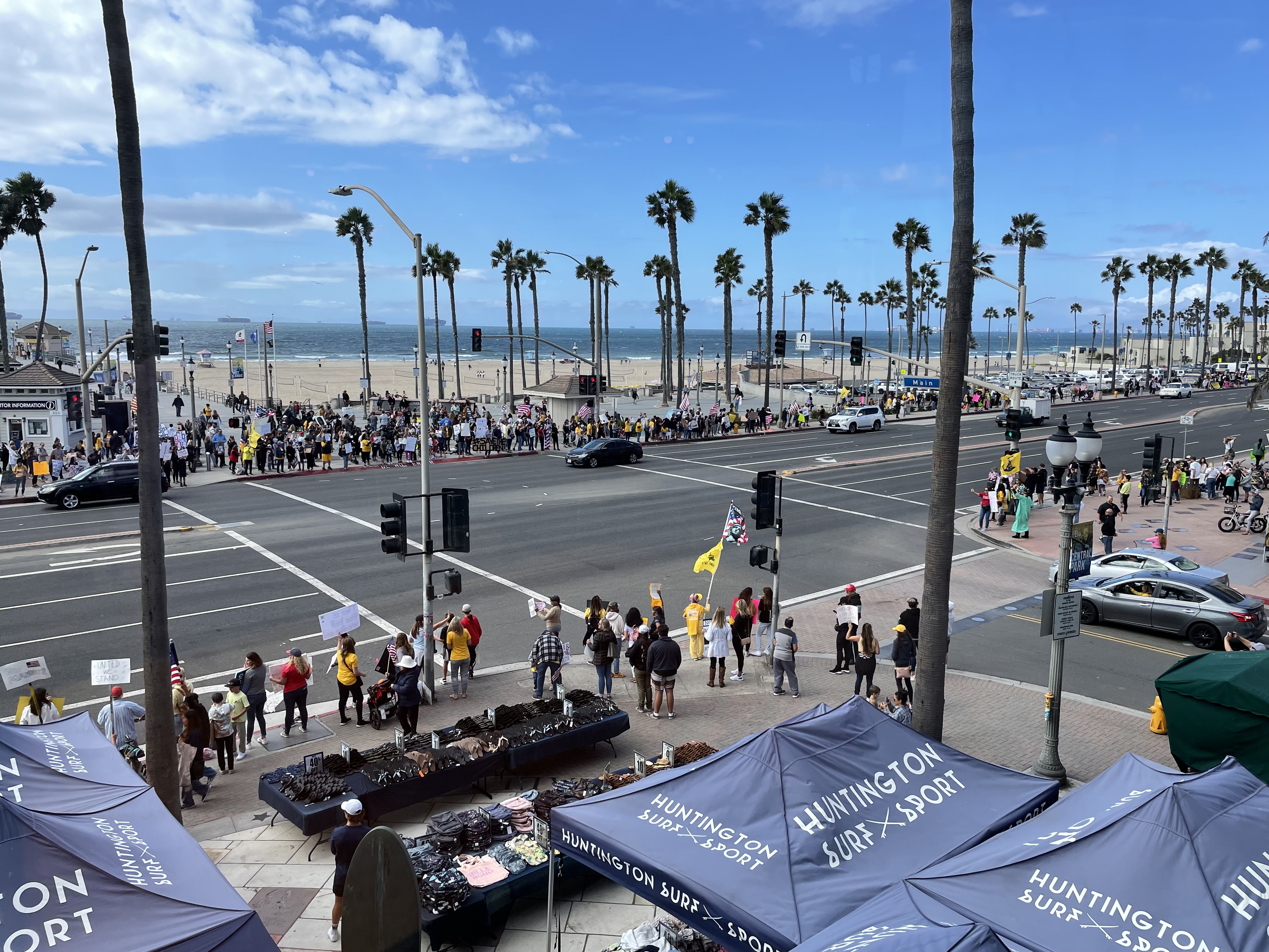 HUNTINGTON BEACH, Calif.—Hundreds of parents, teachers, and students rallied near the Huntington Beach pier Oct. 18 as part of the state-wide “walk-out” to denounce California’s COVID-19 vaccine mandate for K-12 students.