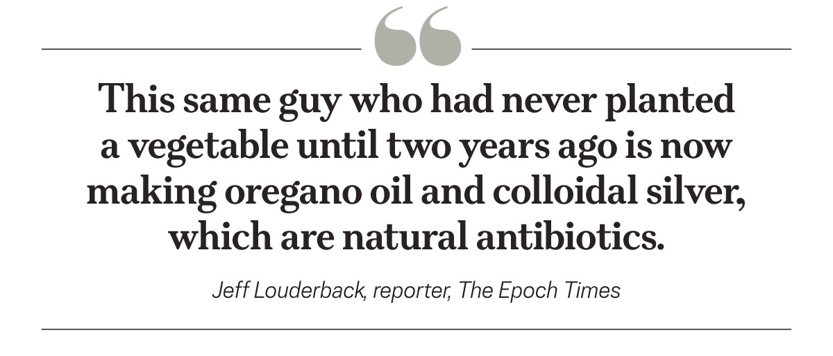 This same guy who had never planted a vegetable until two years ago is now making oregano oil and colloidal silver, which are natural antibiotics.