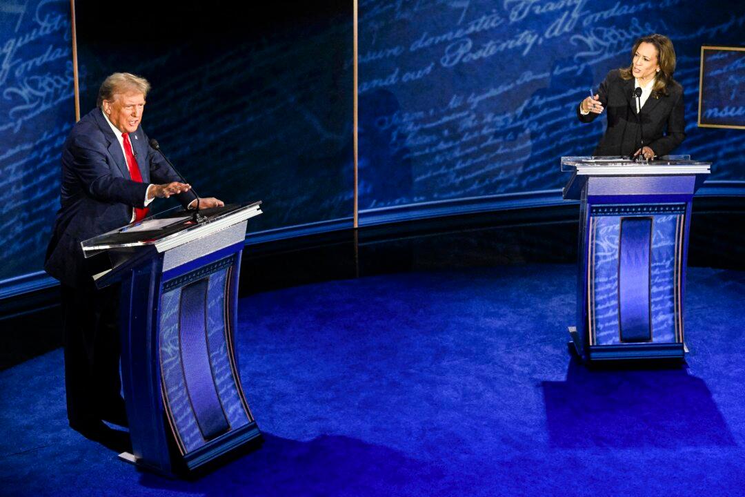 Former President Donald Trump and Vice President Kamala Harris speak during a presidential debate at the National Constitution Center in Philadelphia on Sept. 10, 2024. (Saul Loeb/AFP via Getty Images)