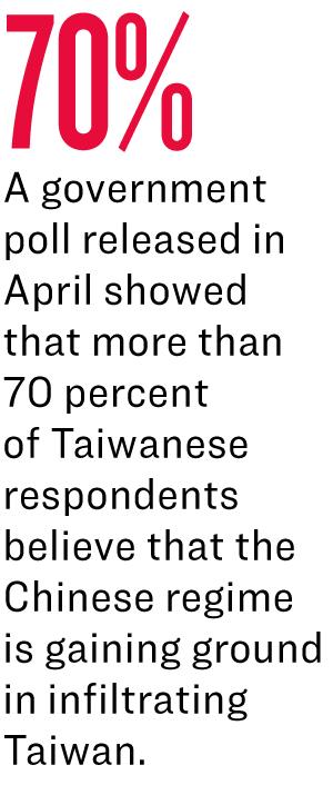 A poll released in April by Taiwan’s Mainland Affairs Council, an administrative agency responsible for handling China affairs, showed that more than 70 percent of approximately 1,100 Taiwanese respondents believe that the Chinese regime is gaining ground in infiltrating Taiwan.