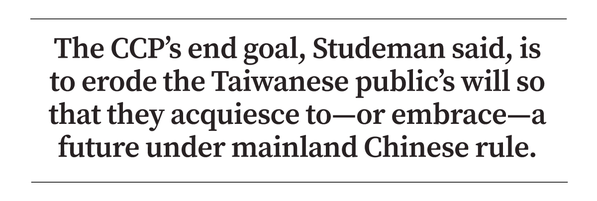 The end goal, Studeman said, is to erode the Taiwanese public’s will so that it acquiesces to—or embraces—a future under mainland Chinese rule.