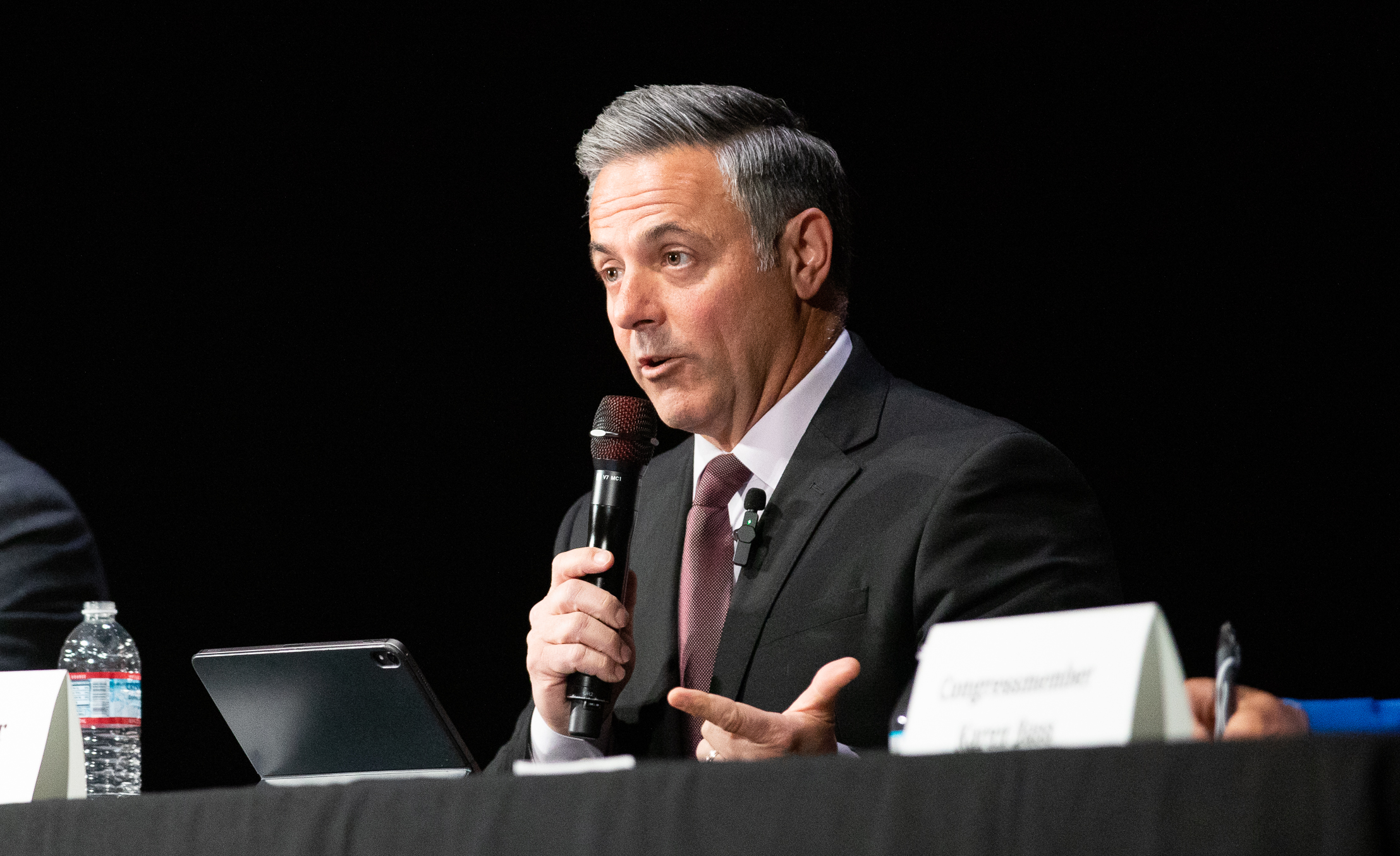 Rick Caruso (2nd R) makes a rebuttal during the mayoral debate with candidates (from L) Joe Buscaino, Kevin de Leon, Karen Bass and Mike Feuer at USC's Bovard Auditorium in Los Angeles on March 22, 2022. (Myung J. Chun/Pool/AFP via Getty Images)