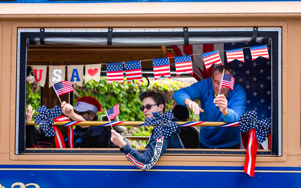 The onshore cool ocean breeze was met with a sunny but cloudy blue sky contrasting vividly with the bright red, white, and blue American flags being waived by parents and children as parade participants—including multiple high school bands—marched past spectators.